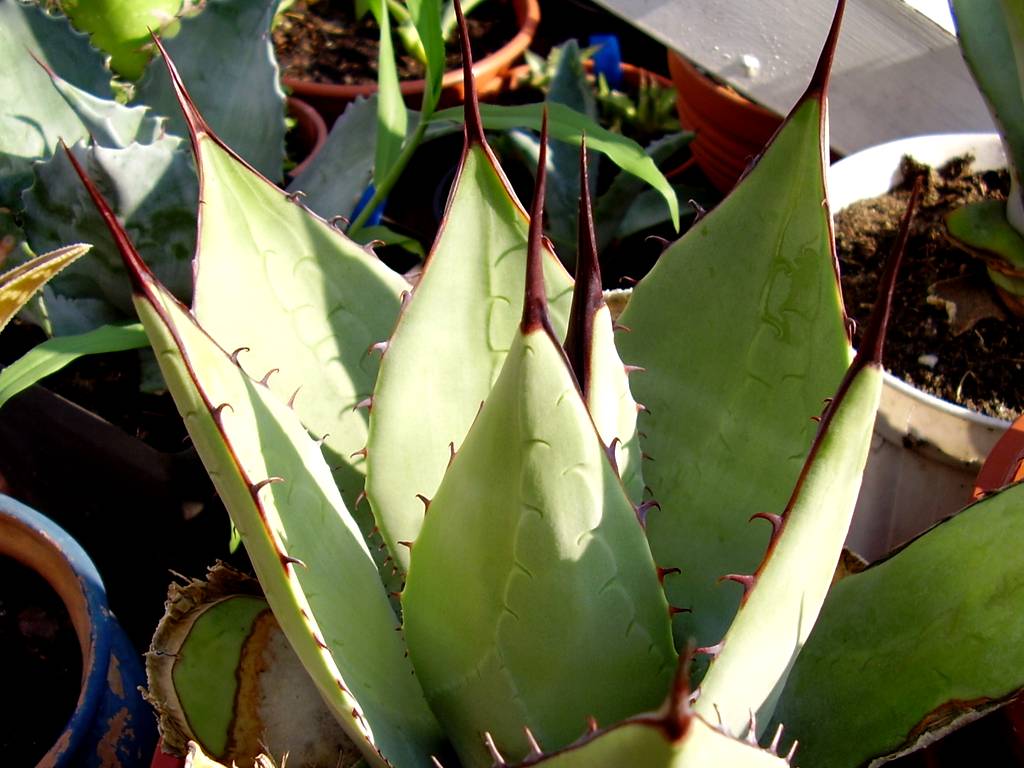 Nie miałem nazwy tej roślinki, przypuszczam, że To A.parryi. Jest jednak bardzo ładna, pięknie kontrastuje szaroniebieski kolor liścia z długim i ciemnym kolcem na jego końcu.